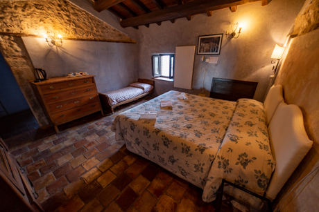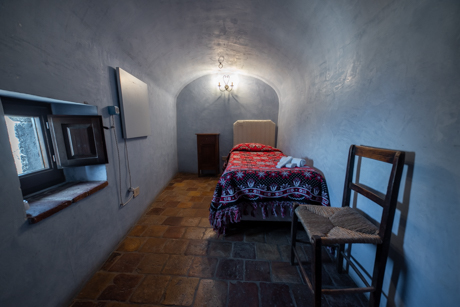 La camera Blu, dal colore azzurro delle sue pareti, è molto spaziosa, ha un letto matrimoniale di misura grande (180 x 200) che può dividersi in due letti singoli, un terzo letto leggermente più corto, per ospitare un bambino fino a dodici anni, e nella seconda stanza, comunicante, con la decorazione di un albero alla parete, vi è ancora un quarto letto singolo standard. Su una delle pareti della camera principale è stato lasciato l’intonaco originale. Ha un comodo bagno con doccia ed è dotata di impianto di riscaldamento a pavimento. Anche questa camera è stata per molti anni un giardino a cielo aperto.