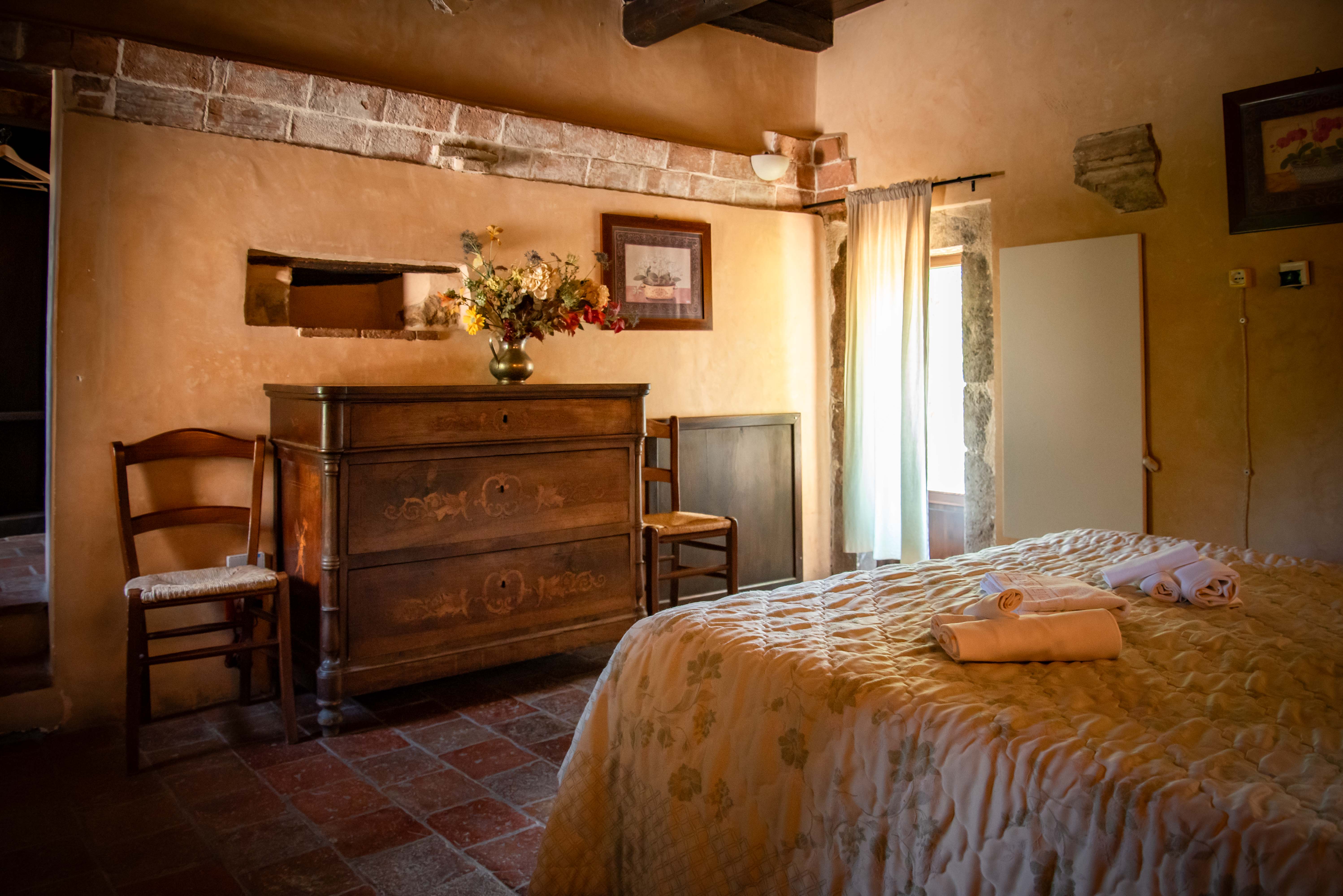 La camera Gialla aveva originariamente delle volte a vela, in mattoni, delle quali rimane traccia, ora ha il soffitto con travi in castagno. Il grande letto matrimoniale (170 x 200) può dividersi in due letti singoli. Questa camera, dotata di impianto di riscaldamento a pavimento, ha anche un piccolo camino originale a fianco del letto. Il bagno ha una vasca con idromassaggio.