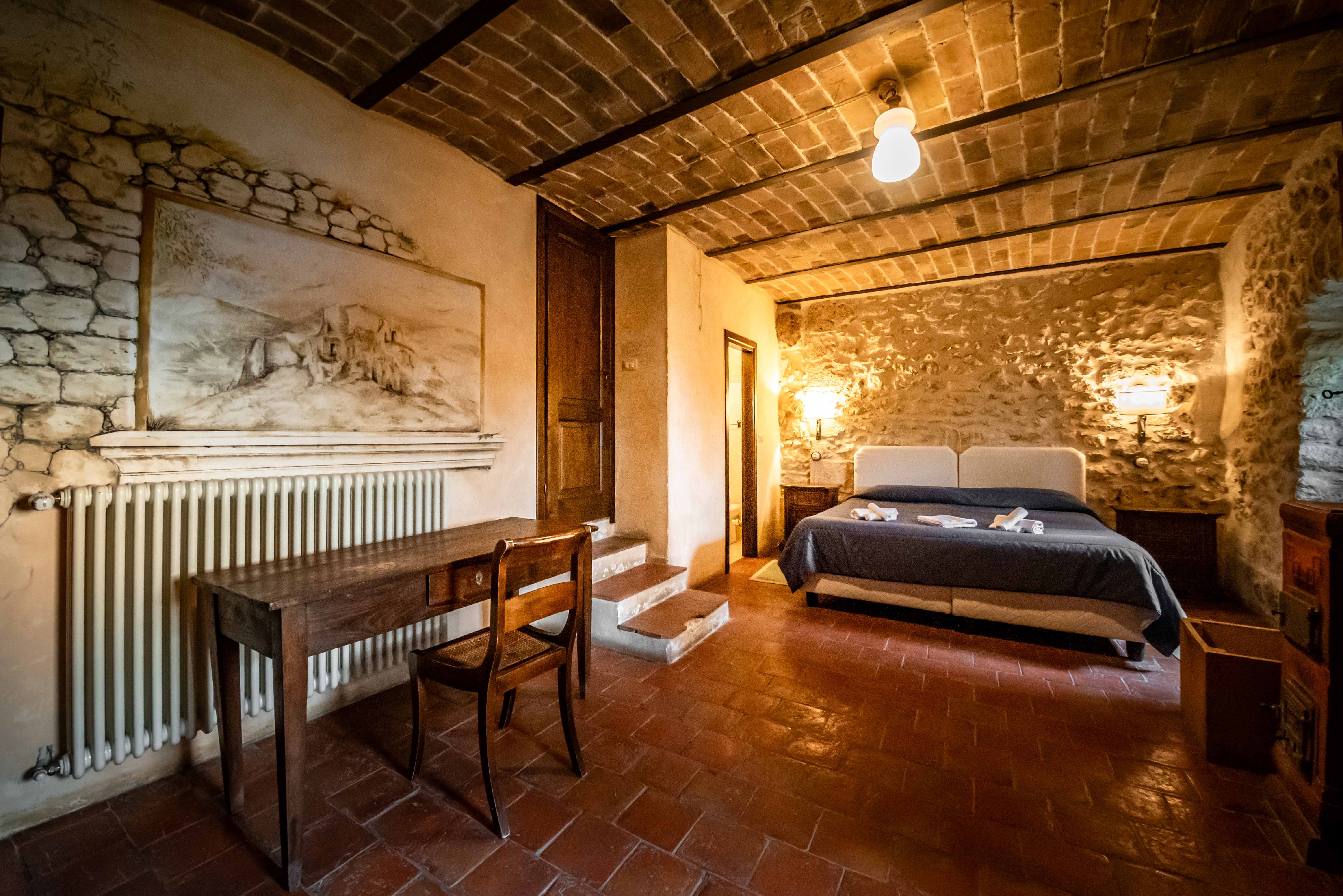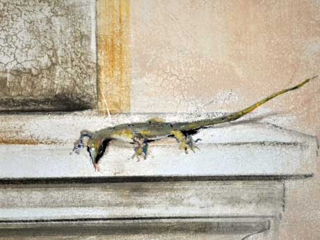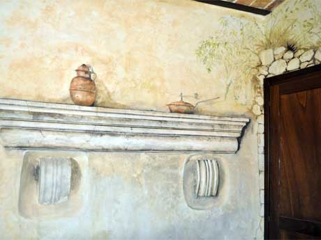 La camera ha due luminose finestre che si affacciano a sud, le decorazioni alle pareti ricostruiscono un camino partendo da una sua pietra originale, e sulla balaustra dipinta si affaccia una piccola lucertola. Oltre ai termosifoni c’è una potente stufa a legna. Il bagno è con doccia. Questa camera autonoma condivide l’ingresso esterno con la camera Scarabeo, può essere quindi abbinata alla camera Scarabeo in caso di famiglie di quattro persone. Il grande letto matrimoniale (180x200) può dividersi in due letti singoli.