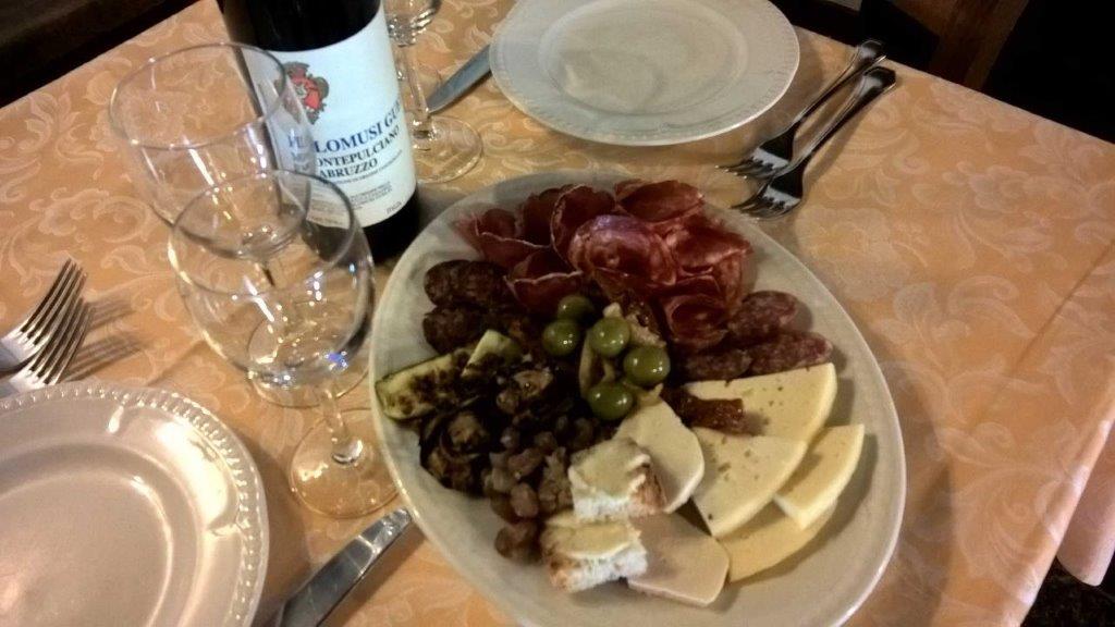 Per cominciare, il classico antipasto è composto da salumi e formaggi locali, tra i salumi la cicolana di carne, la cicolana di fegato, i diavoletti al peperoncino e la lonza nostrana. Tra i formaggi il tipico canestrato di Castel del Monte, un pecorino semi stagionato saporito e leggero, la ricotta fresca e le ricottine salate, insaporite da spezie. Viene arricchito, a seconda della stagione, con verdure grigliate, insalata di cereali o legumi, e altre nostre preparazioni al forno.