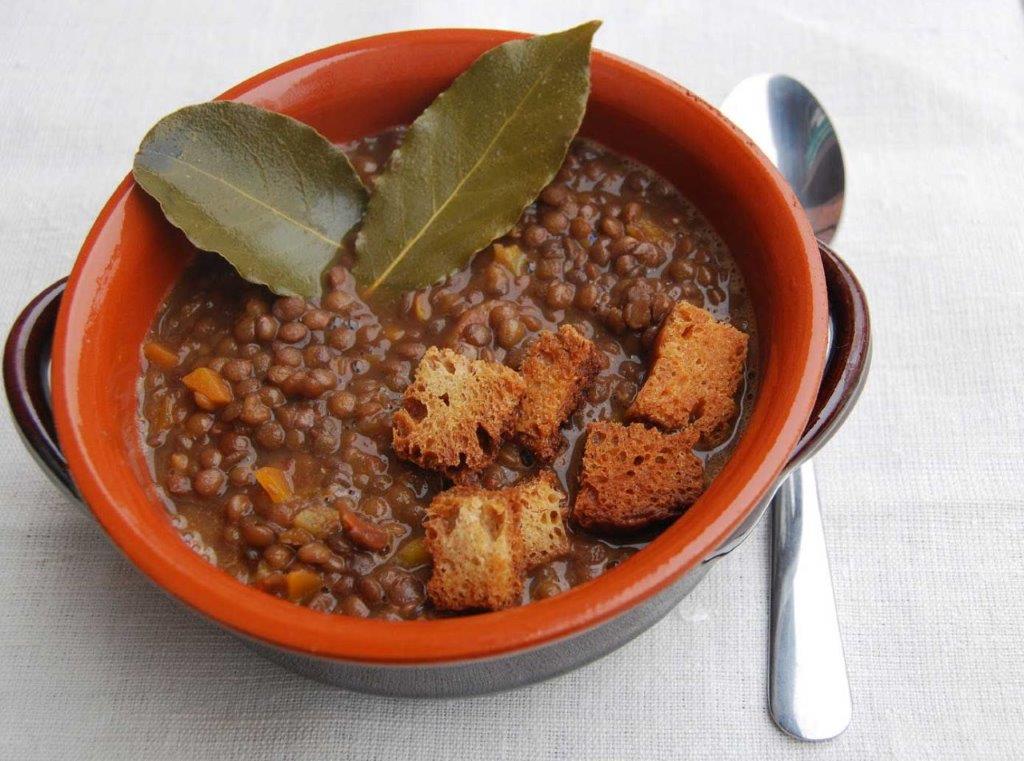 La zuppa di lenticchie è un piatto classico di questa zona, nota per la produzione delle lenticchie di Santo Stefano, piccole, scure e saporite, che vengono cucinate in zuppa con poco aglio rosso di Sulmona, peperoncino e alloro, e servite con crostini di pane.