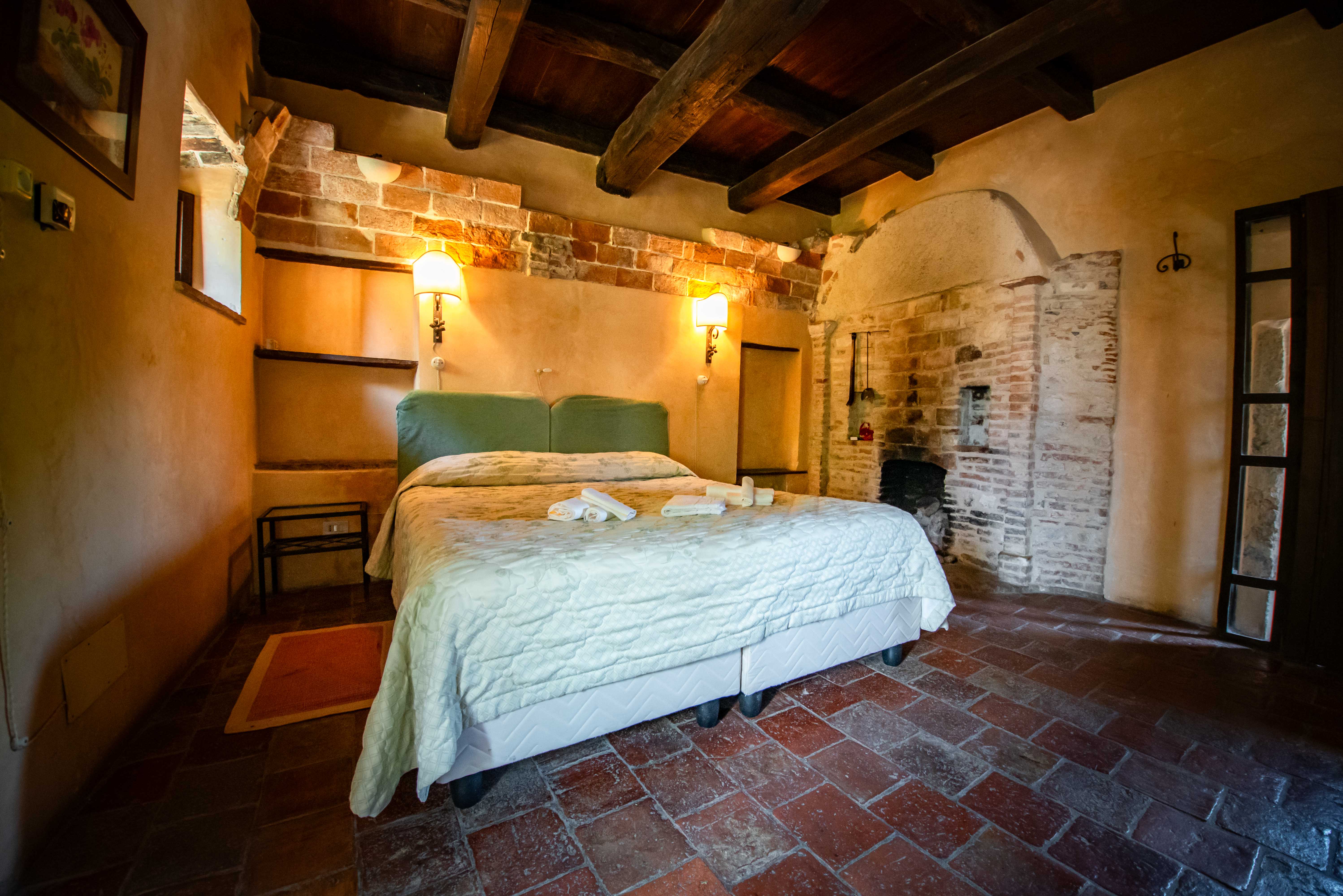 La camera Gialla aveva originariamente delle volte a vela, in mattoni, delle quali rimane traccia, ora ha il soffitto con travi in castagno. Il grande letto matrimoniale (170 x 200) può dividersi in due letti singoli. Questa camera, dotata di impianto di riscaldamento a pavimento, ha anche un piccolo camino originale a fianco del letto. Il bagno ha una vasca con idromassaggio.