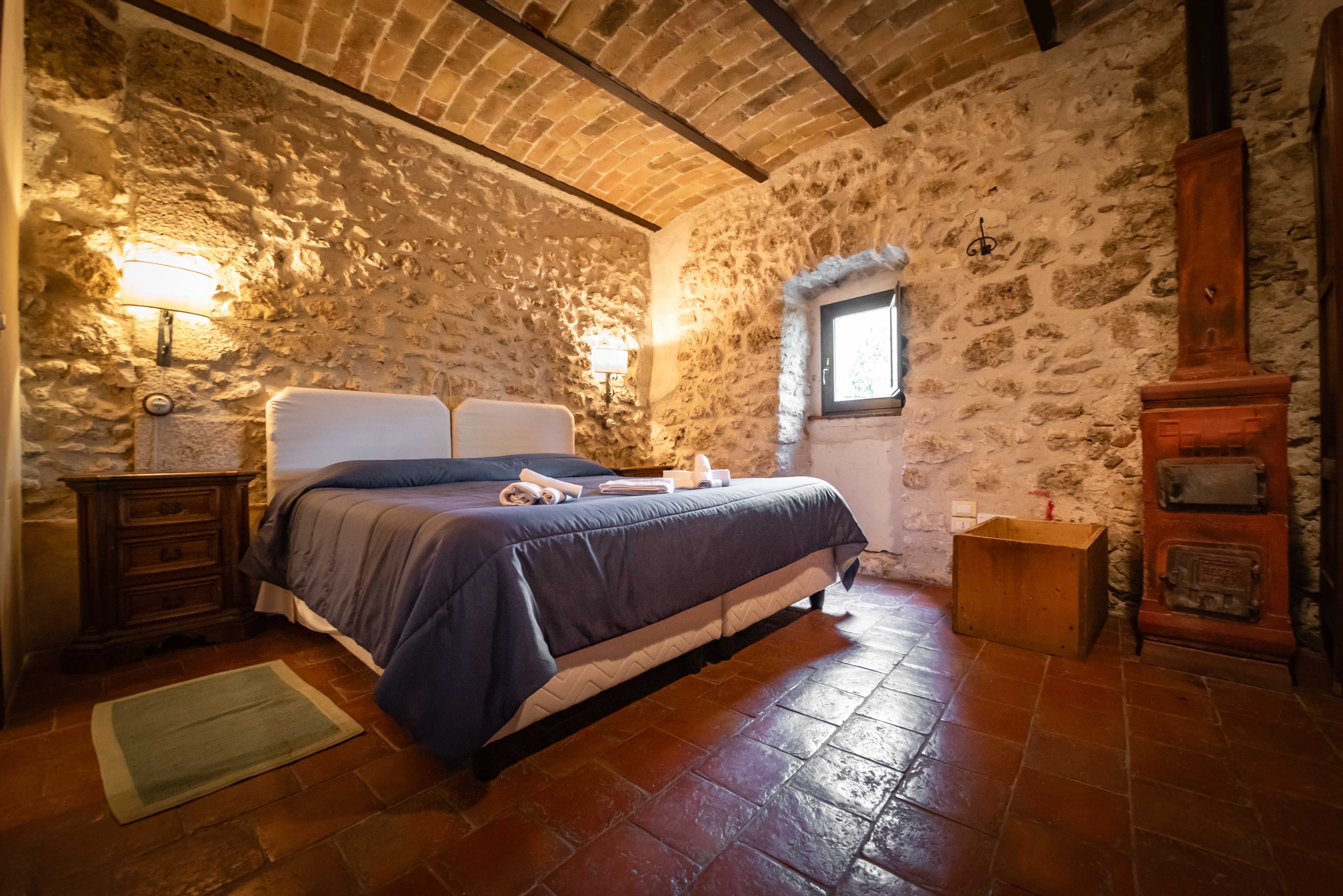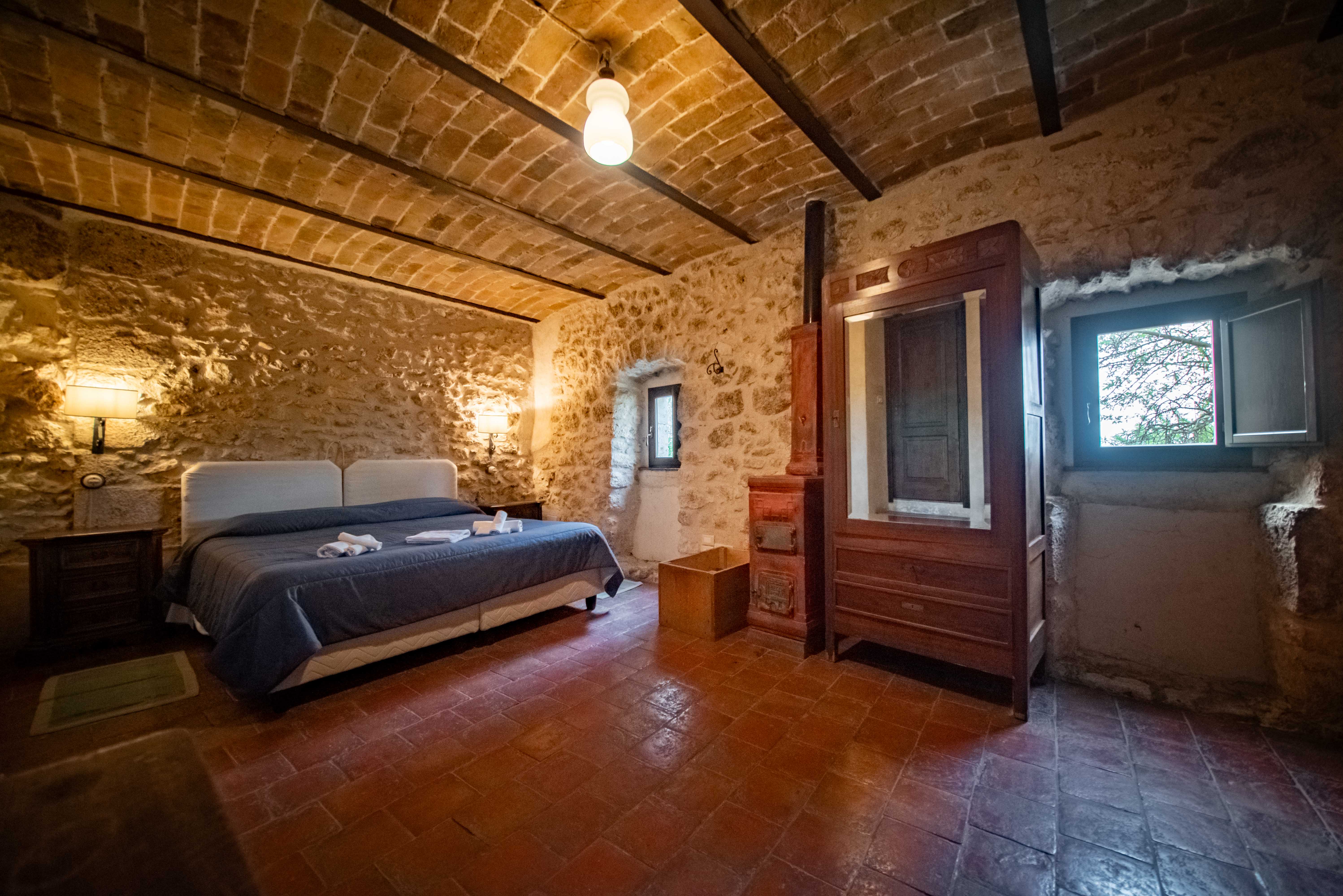 La camera ha due luminose finestre che si affacciano a sud, le decorazioni alle pareti ricostruiscono un camino partendo da una sua pietra originale, e sulla balaustra dipinta si affaccia una piccola lucertola. Oltre ai termosifoni c’è una potente stufa a legna. Il bagno è con doccia. Questa camera autonoma condivide l’ingresso esterno con la camera Scarabeo, può essere quindi abbinata alla camera Scarabeo in caso di famiglie di quattro persone. Il grande letto matrimoniale (180x200) può dividersi in due letti singoli.